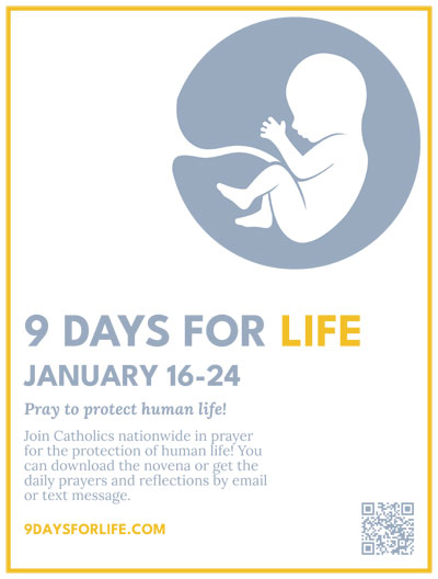 The U.S. bishops' Committee on Pro-Life Activities is sponsoring the Nine Days for Life campaign from Jan. 16-24. It is a multi-faceted novena for the respect and protection of every human life. Each day, a different intention, in English or Spanish, is accompanied by a short reflection, suggested actions and related information.