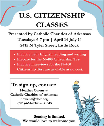 Catholic Charities of Arkansas will offer a free, 12-week class to help individuals prepare for the U.S. citizenship exam. It will be held from 6 to 7 p.m. on Tuesdays from April 14 to July 14 in The McDonald Center on the campus of St. John Catholic Center in Little Rock. Classes will focus on practicing with English reading and writing, preparing for the N-400 citizenship test and practicing interviews for the N-400. The citizenship test are available at no cost. Seating is limited. Register by contacting Heather Owens, immigrant advocate, at (501) 664-0340, ext. 315.