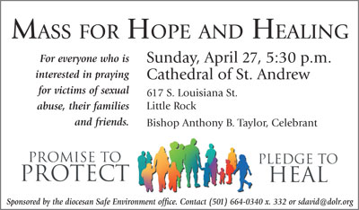 Bishop Anthony B. Taylor will celebrate this Mass at 5:30 p.m. It is being held to pray for healing for survivors of child sexual abuse and commemorate April as National Child Abuse Prevention Month. Anyone who wishes to pray for victims, their families and friends is welcome to attend. This Mass is sponsored by the diocese's Safe Environment Office. For more information, contact Susan David, safe environment coordinator, at (501) 664-0340, ext. 332.