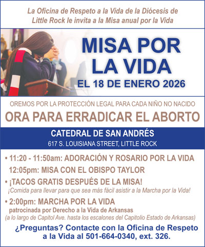 El Obispo Anthony B. Taylor celebrará la Misa anual por la Vida de la Diócesis de Little Rock al mediodía el domingo, 18 de enero, en la Catedral de San Andrés en Little Rock. Antes de la Misa, se rezará un Rosario por la Vida durante la adoración al Santísimo Sacramento, a partir de las 11:20 a.m. en la iglesia.