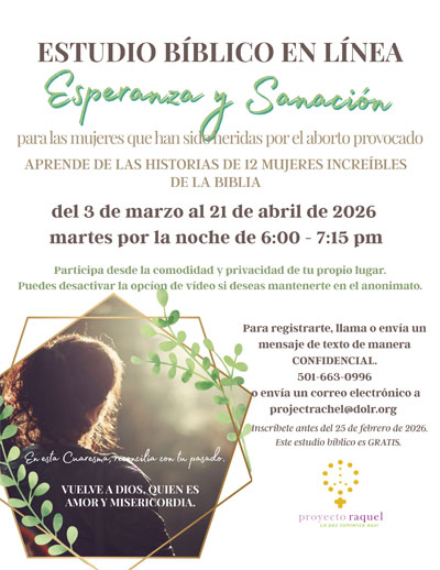 This Bible study is available in English on Monday evenings from March 2 to April 20. Hope and Healing is offered through Project Rachel, a ministry of the Respect Life Office for the Diocese of Little Rock.