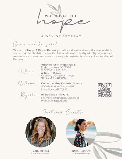 The event will include Mass with Bishop Anthony B. Taylor, the sacrament of reconciliation and adoration of the Blessed Sacrament, presentations, music and lunch. All women in the Diocese of Little Rock are invited to attend.
