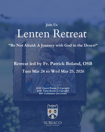 This event will be held from 4 p.m. Tuesday, March 24 to 3:30 p.m. Wednesday, March 25 at Coury House Retreat Center on the grounds of Subiaco Abbey. Father Patrick Boland, OSB, will be the featured speaker. The retreat will include talks, vespers with the Benedictine monks, Mass, the sacrament of reconciliation, Eucharistic adoration, outdoor Stations of the Cross and individual time for prayer and reflection. For more information, or to register online, visit the retreat center's website.